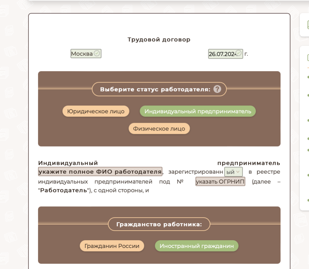 Вы можете настроить условия онлайн с помощью конструктора, выбрав ниже подходящий образец трудового договора (срочный, дистанционный, общий и т.п.). Конструктор на ваших глазах собирает документ, главное выбрать подходящие вам условия. Заполнить поля документа вы можете на сайте или своём устройстве.