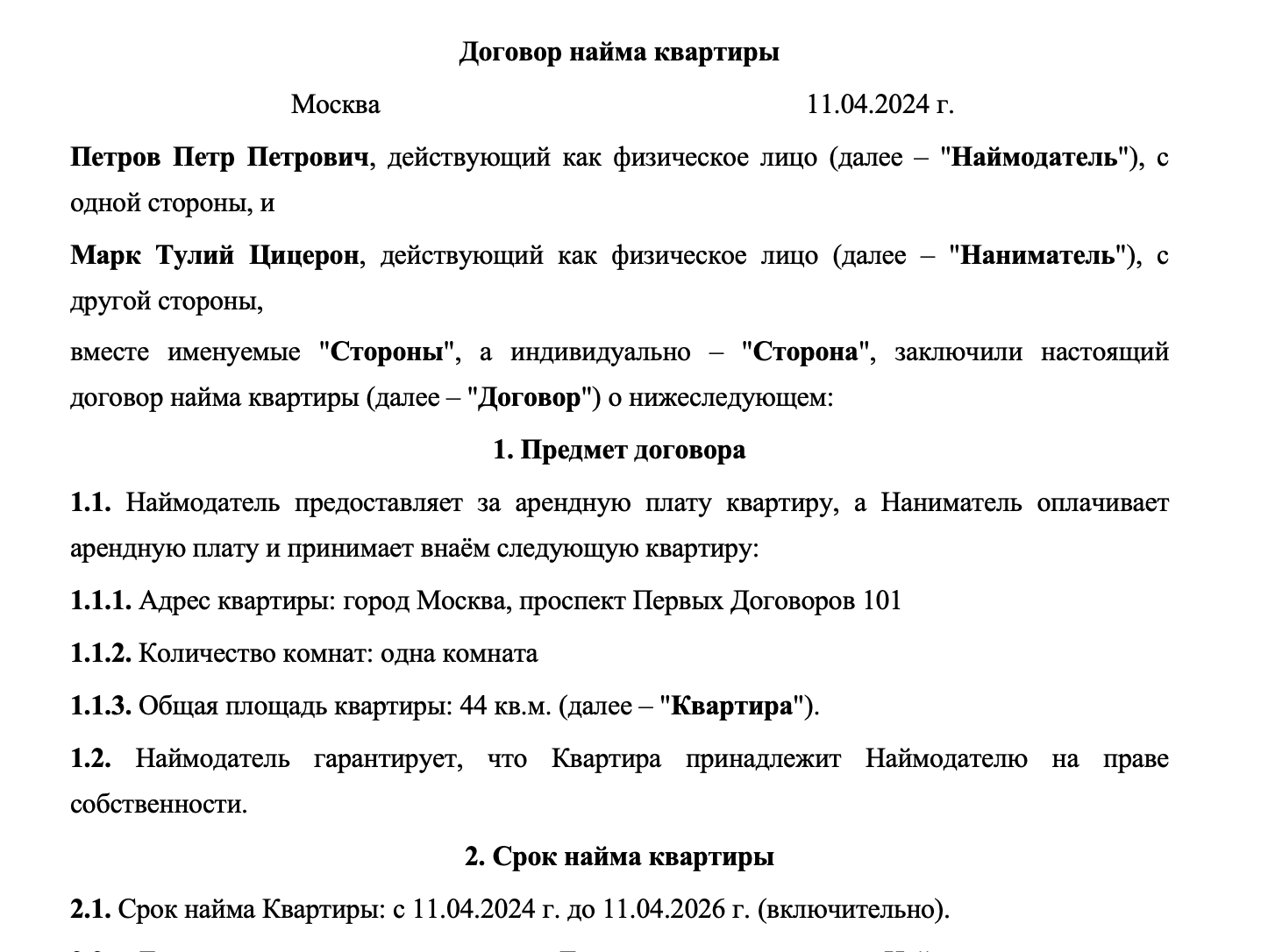 Самое важное: точный адрес жилого помещения, срок найма, размер арендной платы и достоверные данные о сторонах.