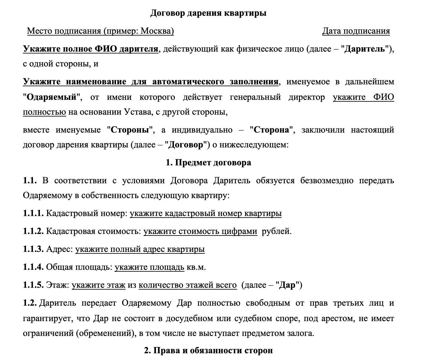1.1. Даритель передает Одаряемому Дар в срок до г. в следующем месте: укажите место передачи дараdar_4_2024
