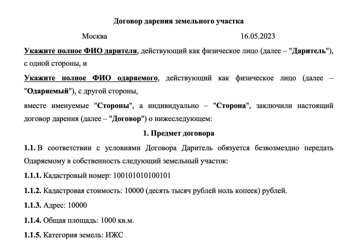 1.1. В соответствии с условиями Договора Даритель обязуется безвозмездно передать Одаряемому в собственность следующий земельный участок: