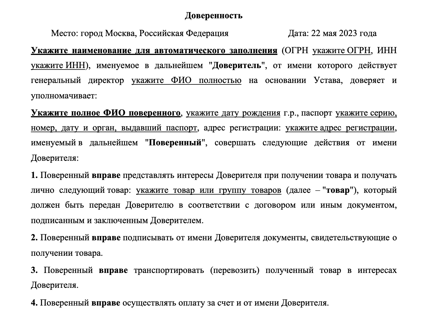 1. Поверенный вправе представлять интересы Доверителя при получении товара и получать лично следующий товар: укажите товар или группу товаровdover_1 (далее – "товар"), который должен быть передан Доверителю в соответствии с договором или иным документом, подписанным и заключенным Доверителем.